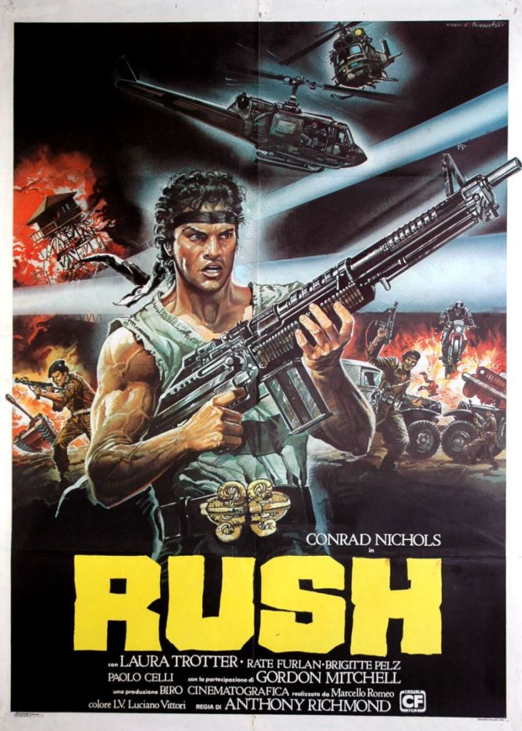 RUSH (Italy, Oct 1983). Here’s an idea: combine Road Warrior with First Blood! (First Blood was an even bigger hit than The Road Warrior, enjoying three weeks at number one in late 1982).