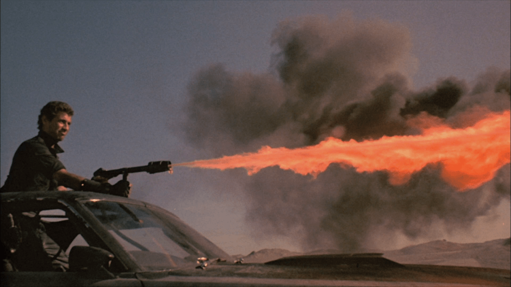 10. FIRE. This is a relatively minor convergence, but nearly all Road Warrior imitators feature flamethrowers or firebombs or some kind of flame weapons. Maybe it’s because vehicles run on gasoline, and gasoline is flammable. Flame weapons get used even in the films where gasoline is scarce. I guess bullets are even scarcer.