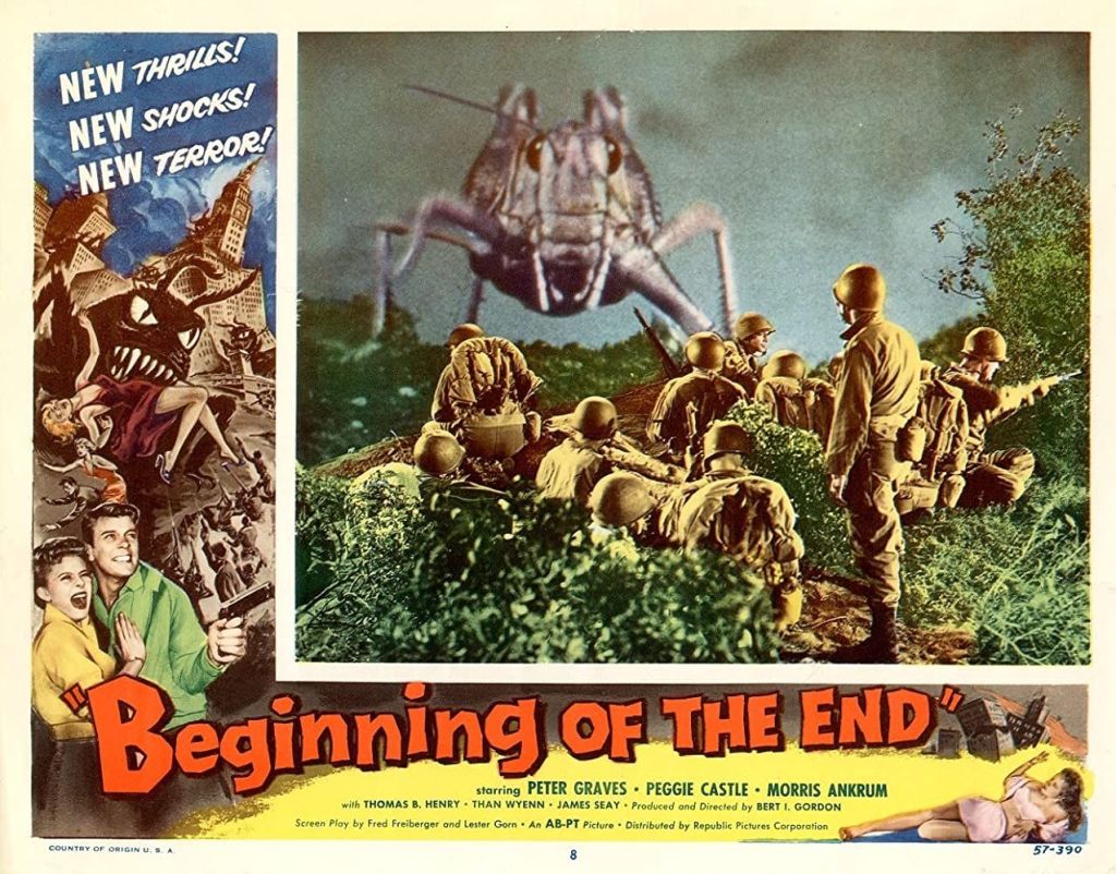 4. BEGINNING OF THE END (1957): From Bert I. Gordon (“Mr. BIG”) comes a surprisingly exciting story about giant grasshoppers attacking Chicago. Live grasshoppers are used, shot to look huge. In several shots, you can tell that it’s just life-sized grasshoppers crawling over some photographs. But the acting is strong (Peter Graves!) and, heck, the whole thing is only 75 minutes anyway.