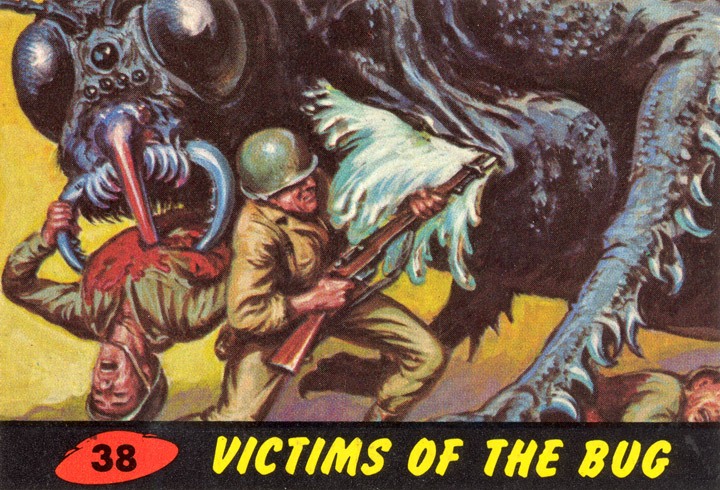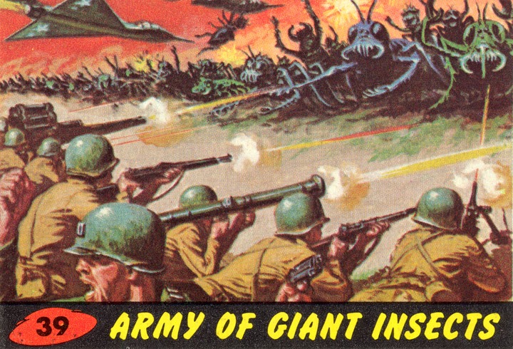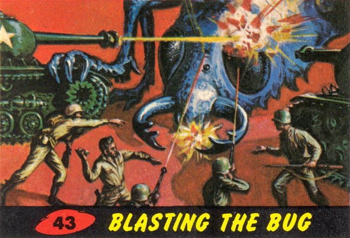 Even when their heyday had passed, Big Bug movies lingered on in American pop culture. In the 1962 Mars Attacks trading cards, giant insects figured into no less than a dozen cards, as the Martians use super-science to enlarge Earth’s insects and send them on murderous rampages.